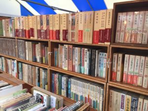 テントのなかには、100円均一の文庫から、小説、古雑誌や漫画、洋書に写真集など、多数の古書が並んでいます。