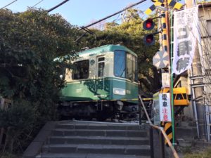 (鳥居の前を通過する江ノ電 夢中図書館「鎌倉七福神巡り」より)