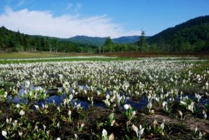 水辺に白い花を咲かせるミズバショウ、紫色のカキツバタ、白い綿毛のようなワタスゲなどなど。