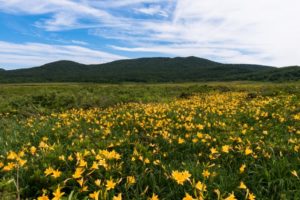 標高1000mの高地にある雄国沼の周辺に広がる、ニッコウキスゲの大群落です。