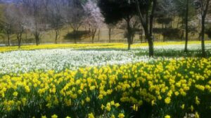 約6万株のスイセンが咲く花畑。これは「秩父ミューズパーク」の林間広場です。