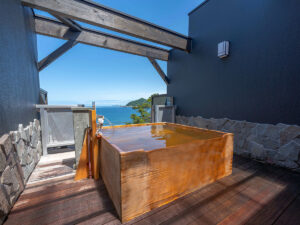 この宿の露天風呂も絶景です…。海岸沿いの露天風呂「浜千鳥の湯」は、目の前がすぐ海です。