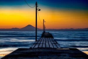 桟橋の先に東京湾越しの富士と夕日が広がります。これはたまりません…。都内近郊の鉄道旅で癒されるってのもいいなぁ…。