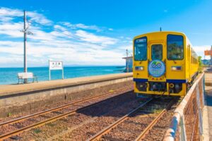 そして、「青く輝く半島の海沿いをゆく幸せの黄色い列車」。島原鉄道(長崎県)です。